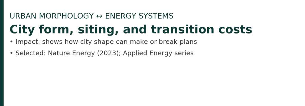 Dense urban form and a warming climate jointly raise electricity demand—especially peaks—and add volatility that complicates renewable integration. Plans that ignore these effects tend to underinvest and face reliability gaps. I propose co-optimizing urban morphology (density, siting, shading/ventilation) together with energy portfolios (renewables, storage, flexible demand, firm capacity) consistently cuts costs while improving resilience, compared with treating city design and energy systems separately.