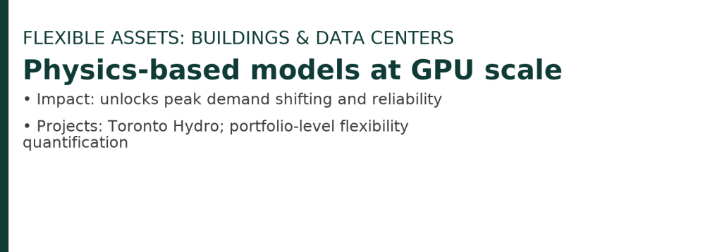 I use GPU-accelerated simulations to scale physics-based resistor capacitor (RC) building models from single structures to city- and region-level cohorts. The framework couples these RC models with subsurface thermal storage—including aquifer thermal energy storage (ATES) (and, where relevant, borehole TES)—to represent charging/discharging, transport losses, and comfort constraints. This lets us quantify how portfolios of buildings can shift heating/cooling demand, firm up renewables, and reduce peak stress on the grid under extreme weather. Result: fast, high-resolution planning tools that are both computationally efficient and physically more accurate.